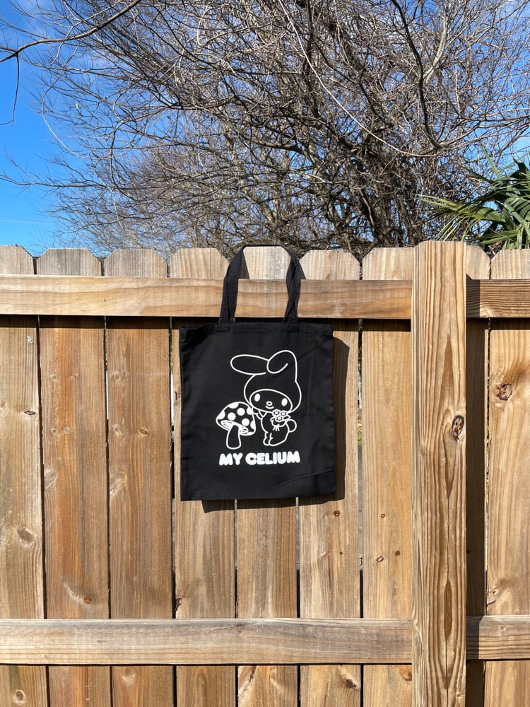 My Celium tote bag, a popular character bootleg designed by me with mushrooms in mind. Printed in New Orleans.